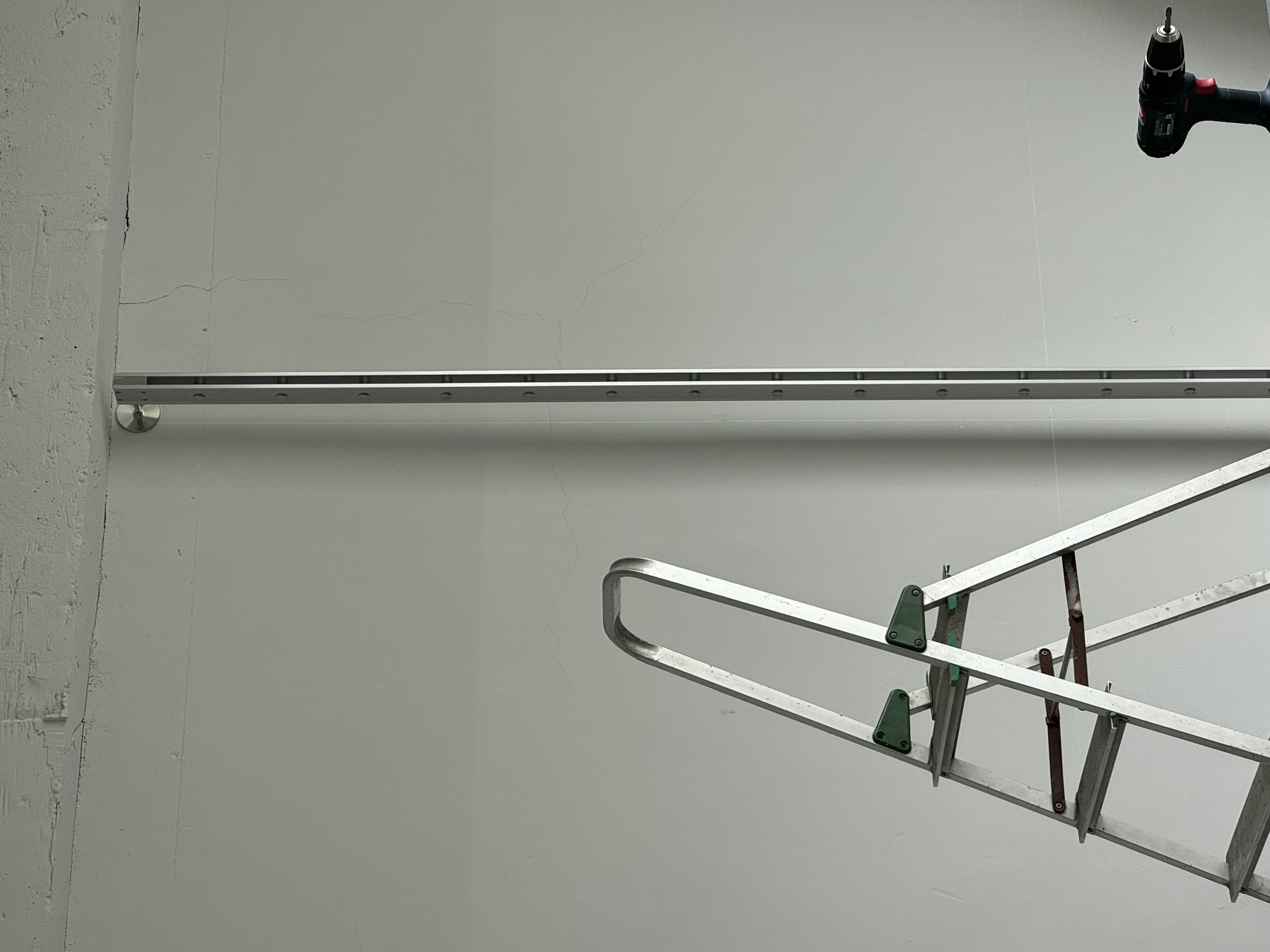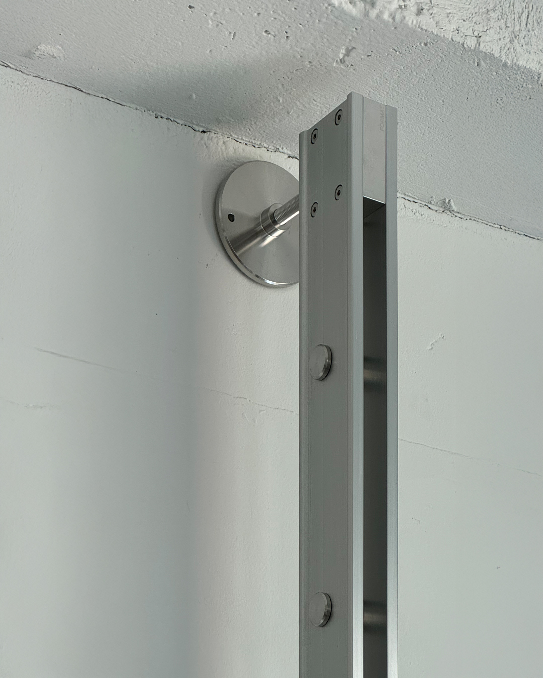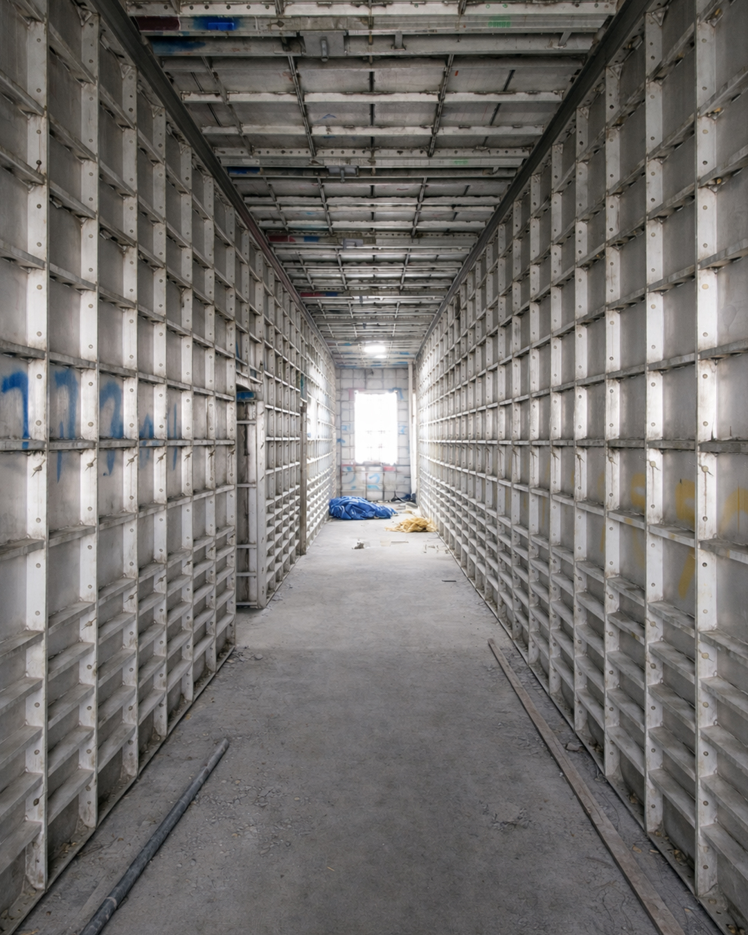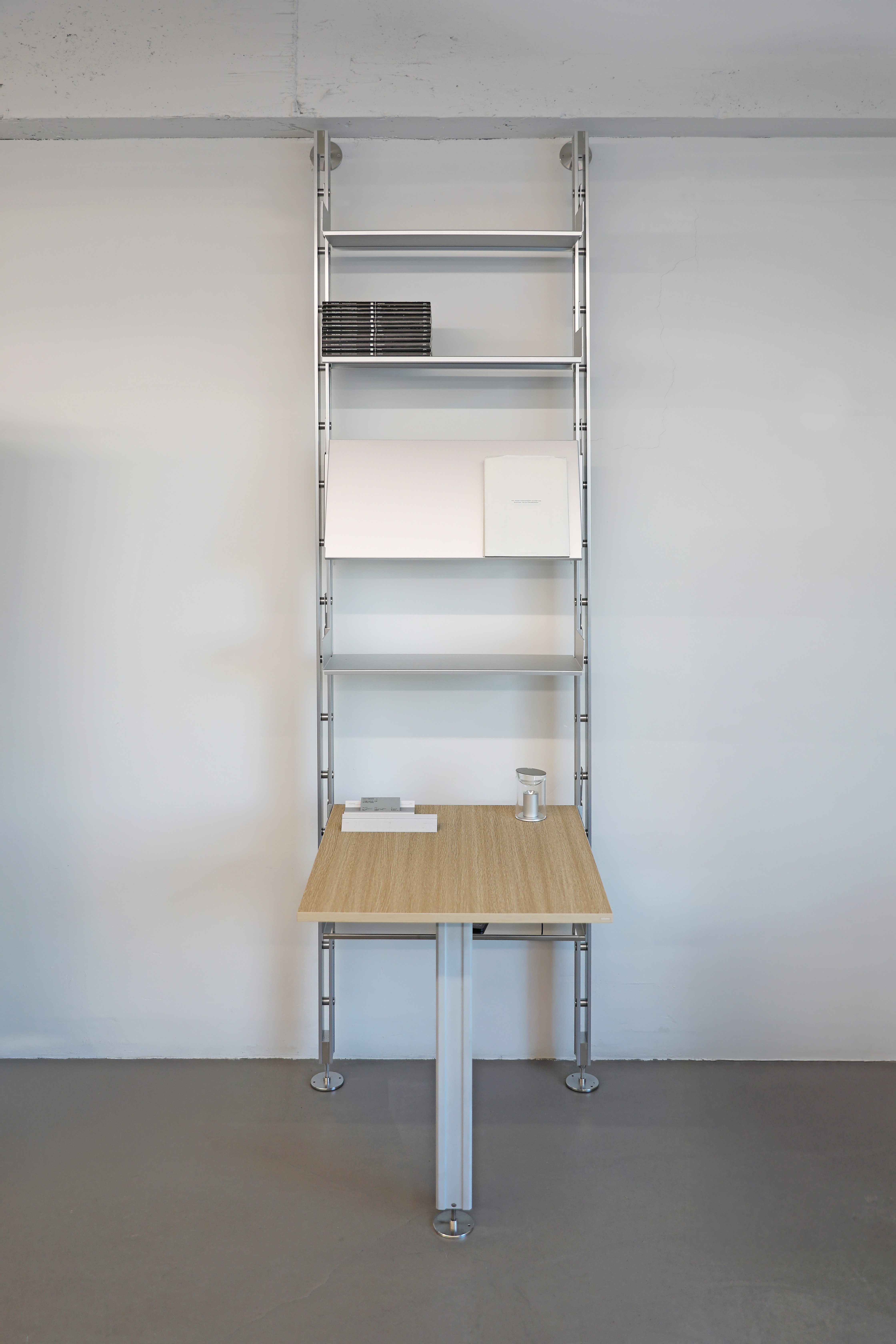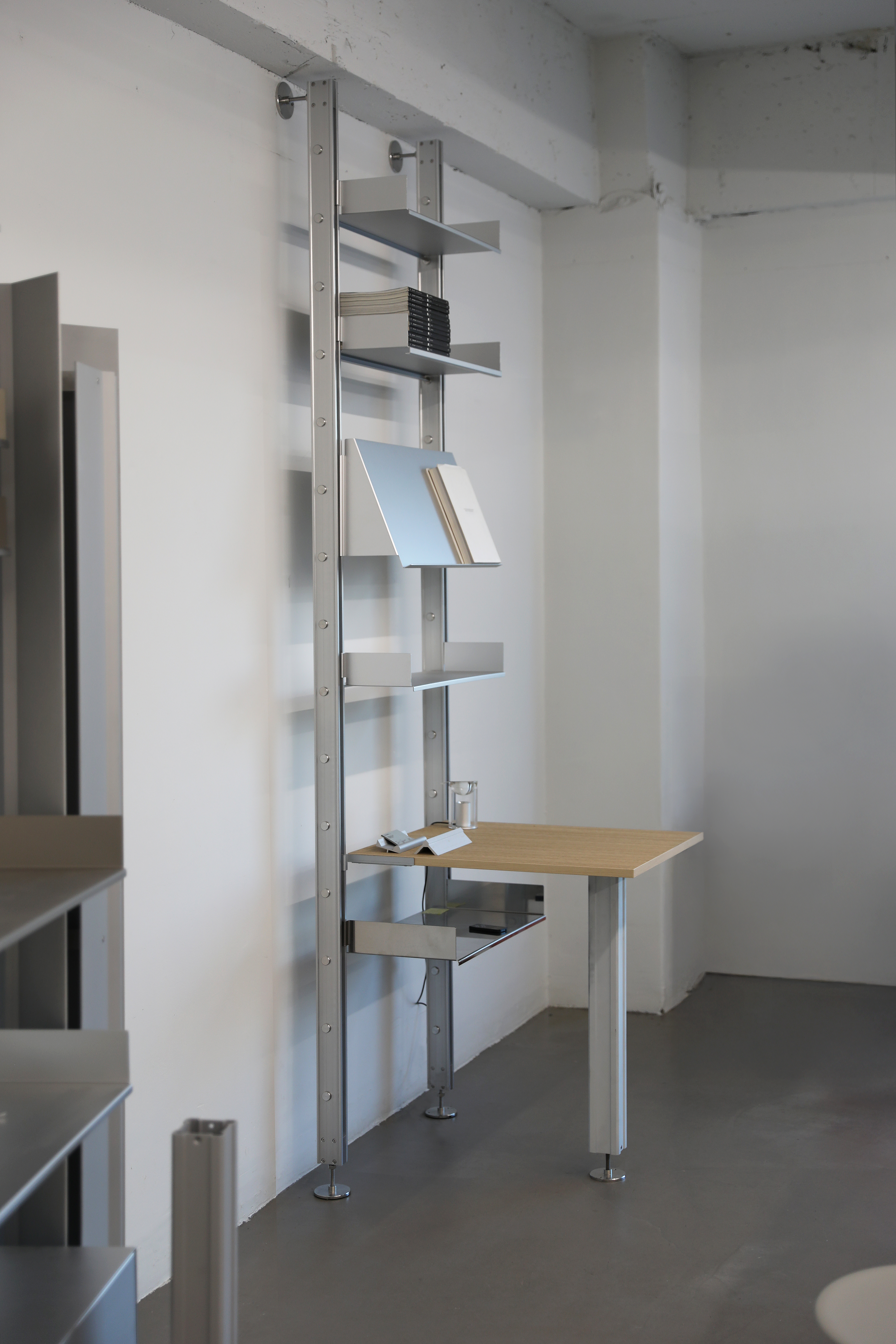 The third product in the collection is a system shelving unit. Standardized formwork components are disassembled, cut, and reassembled to form a modular system furniture piece. Drawing inspiration from the repetitive assembly and disassembly process of aluminum formwork used on construction sites, the design centers on a vertical rail structure, which serves as the core structural element of the shelving system. The shelf rails, derived from the original assembly logic of the formwork, along with newly developed brackets that anchor the system to the wall and floor, ensure both structural stability and visual clarity.