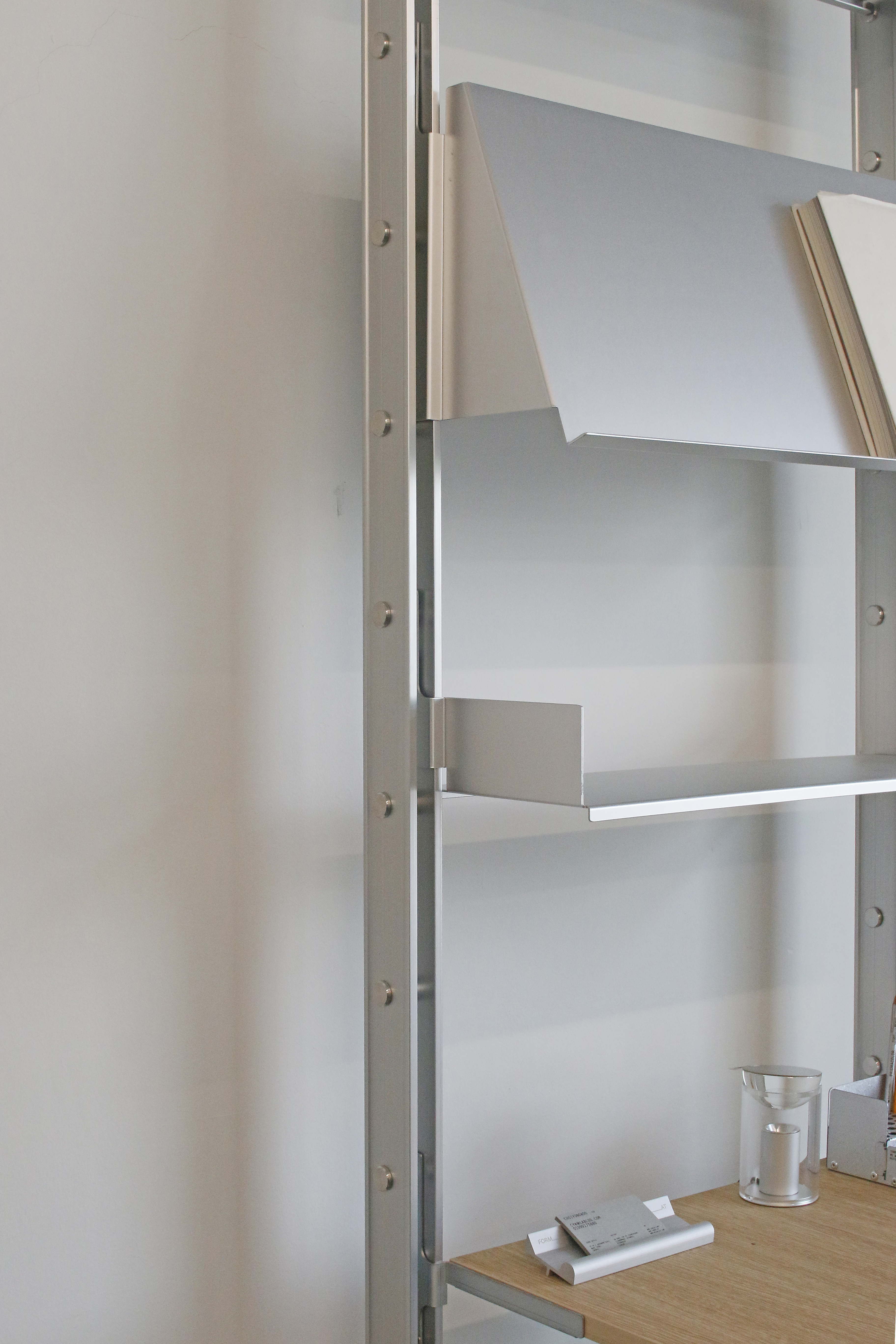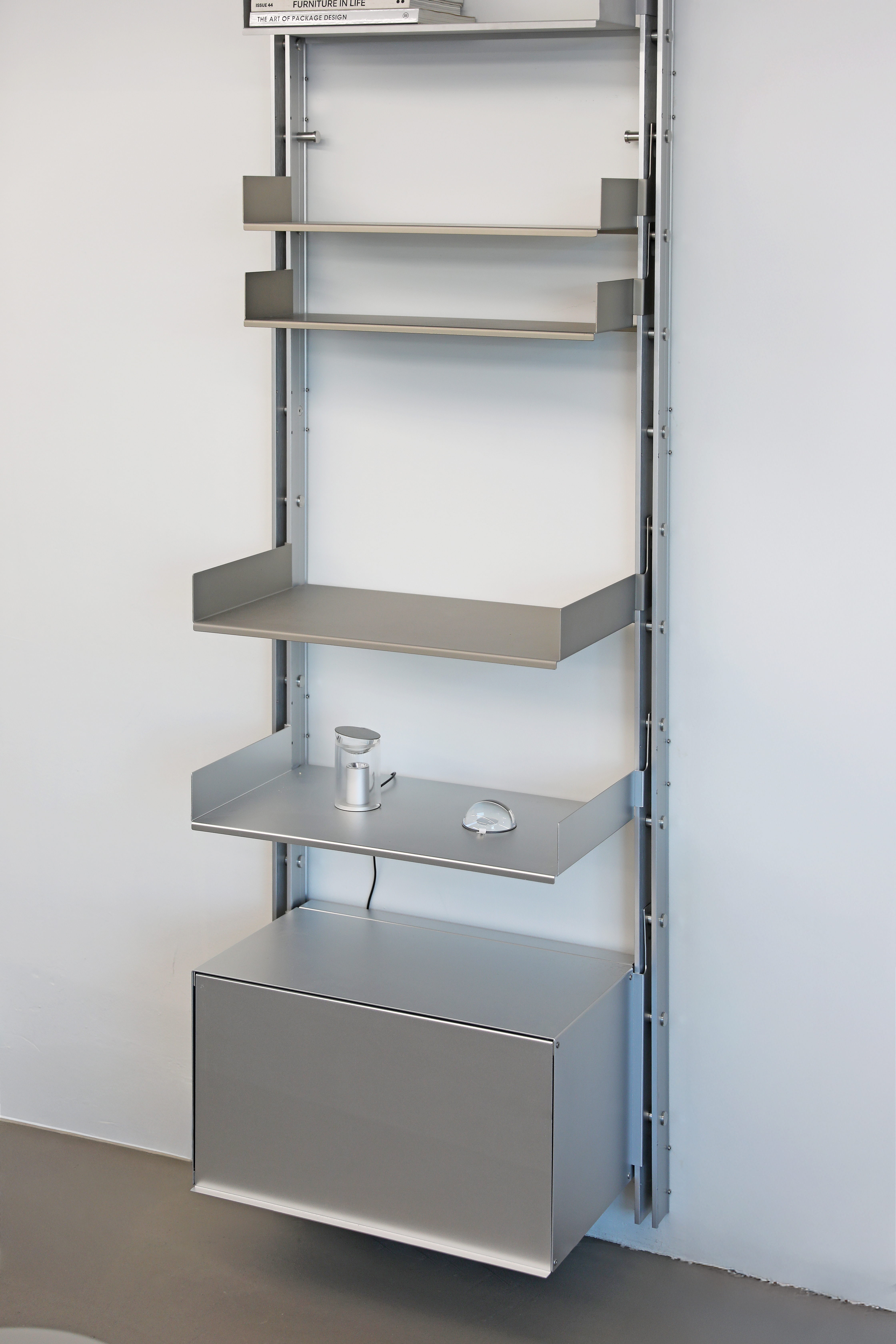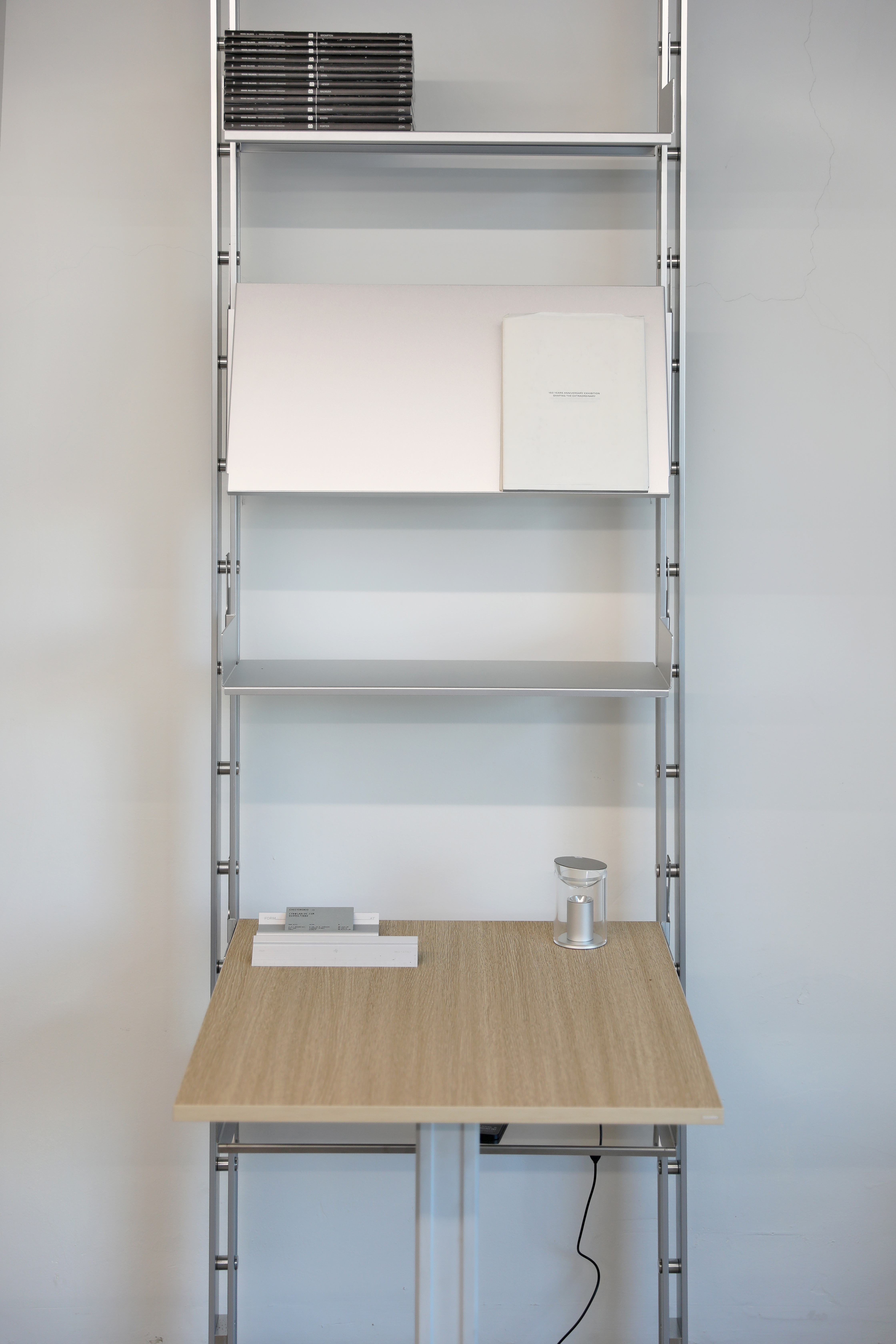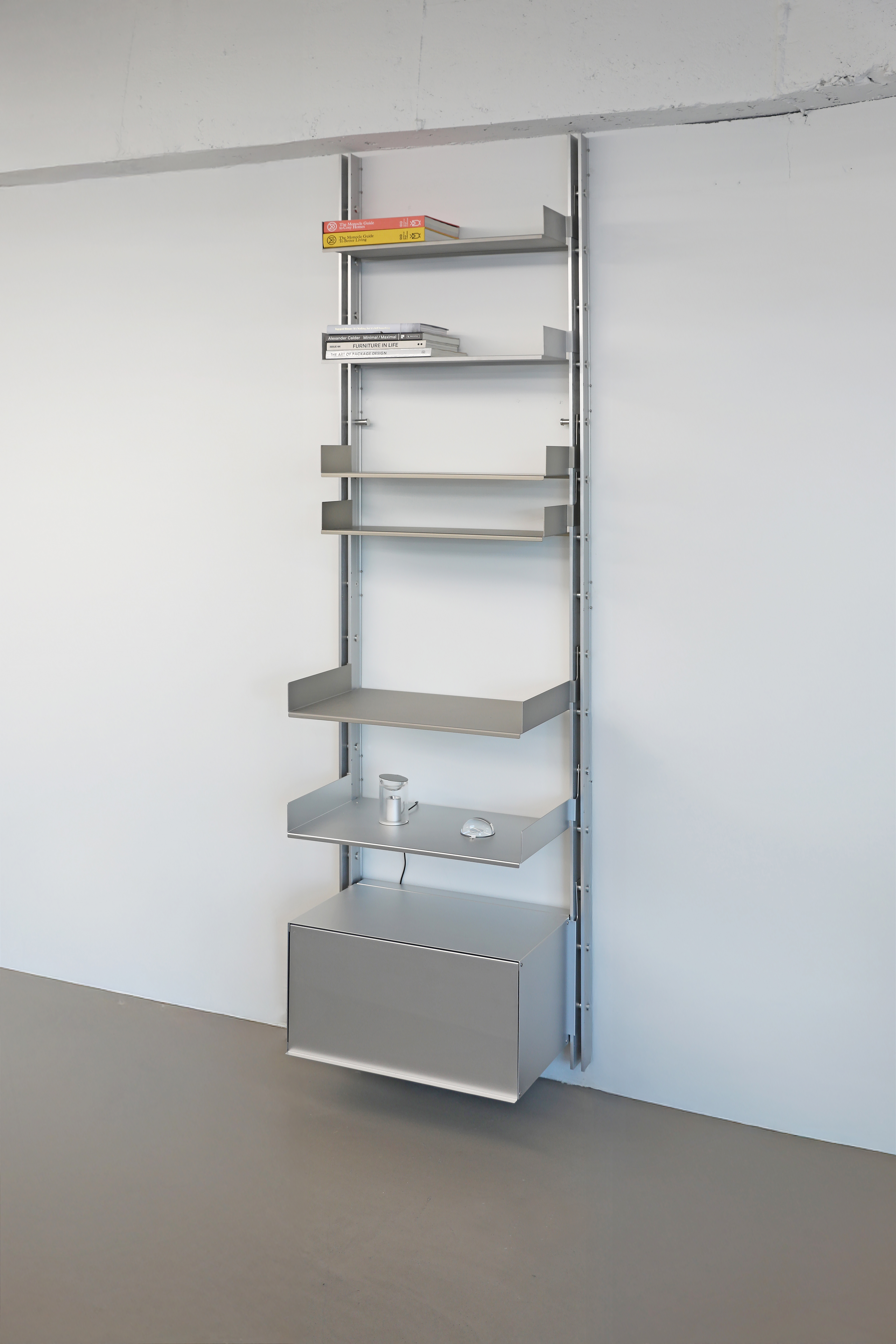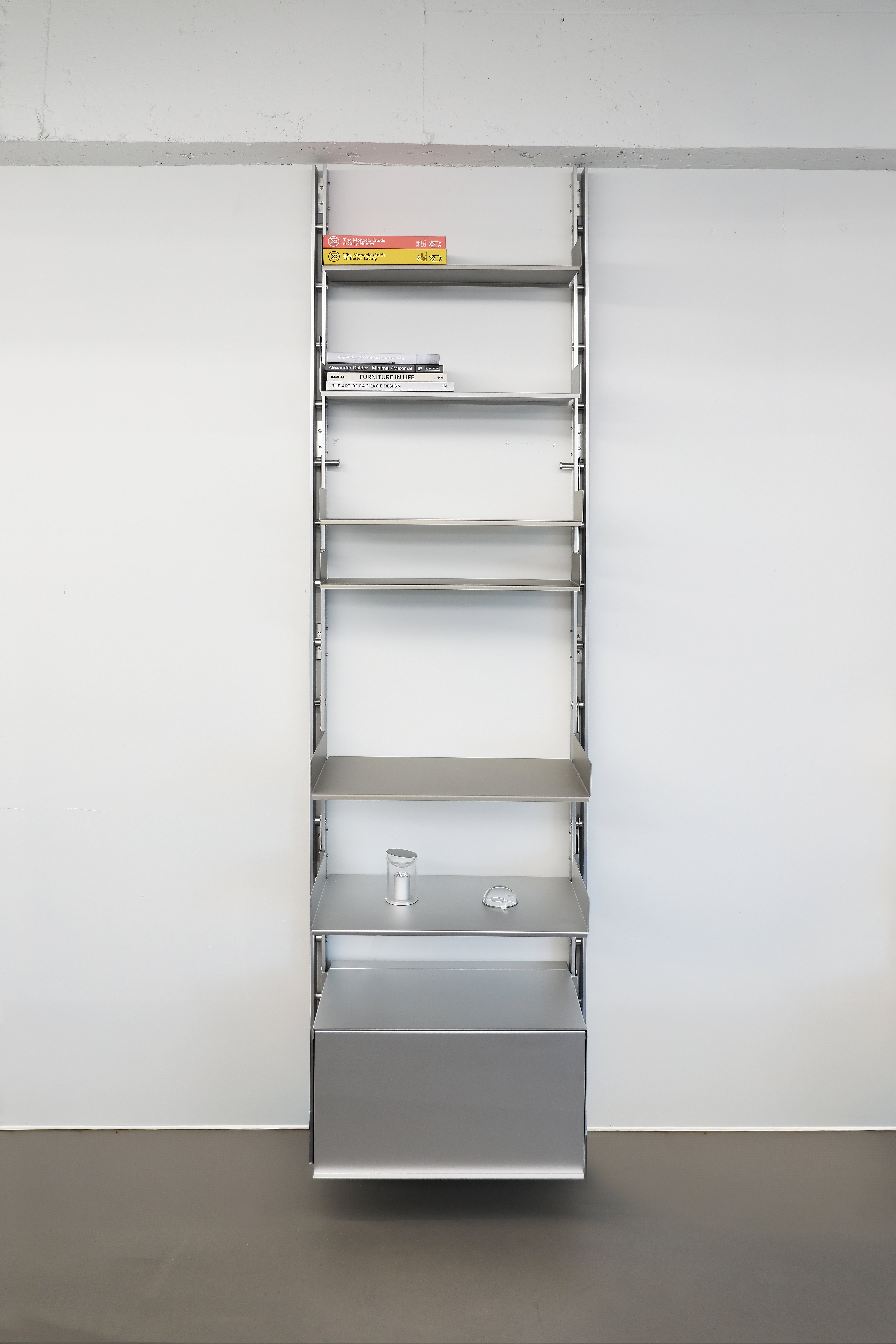 Rather than functioning as a fixed piece of furniture, the shelving system is designed to expand and be reconfigured according to changes in space and user needs. Components originally engineered for functional efficiency in industrial contexts are transformed into elements for everyday storage and display, while the rigid metal structure introduces a sense of order and calm within the space.