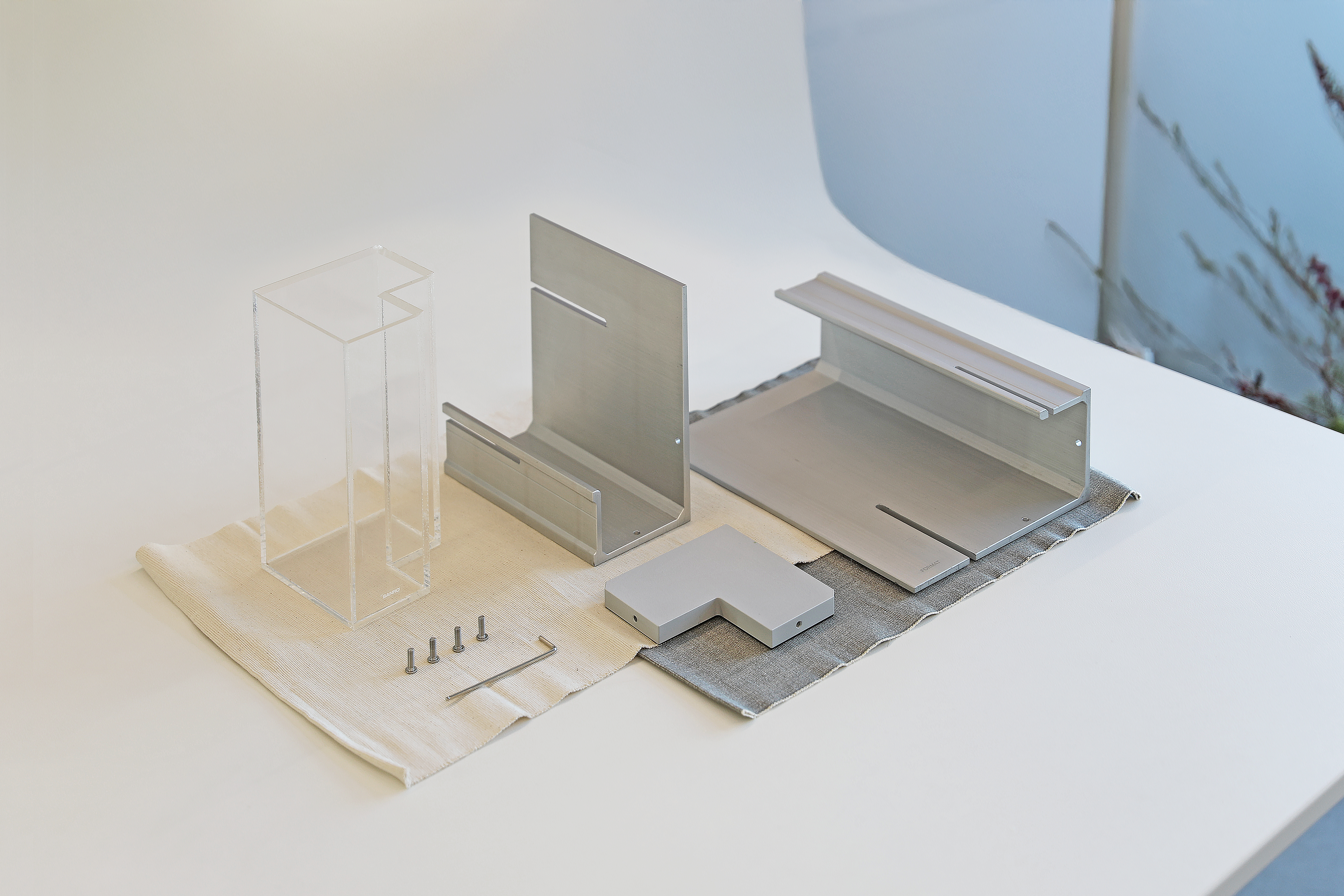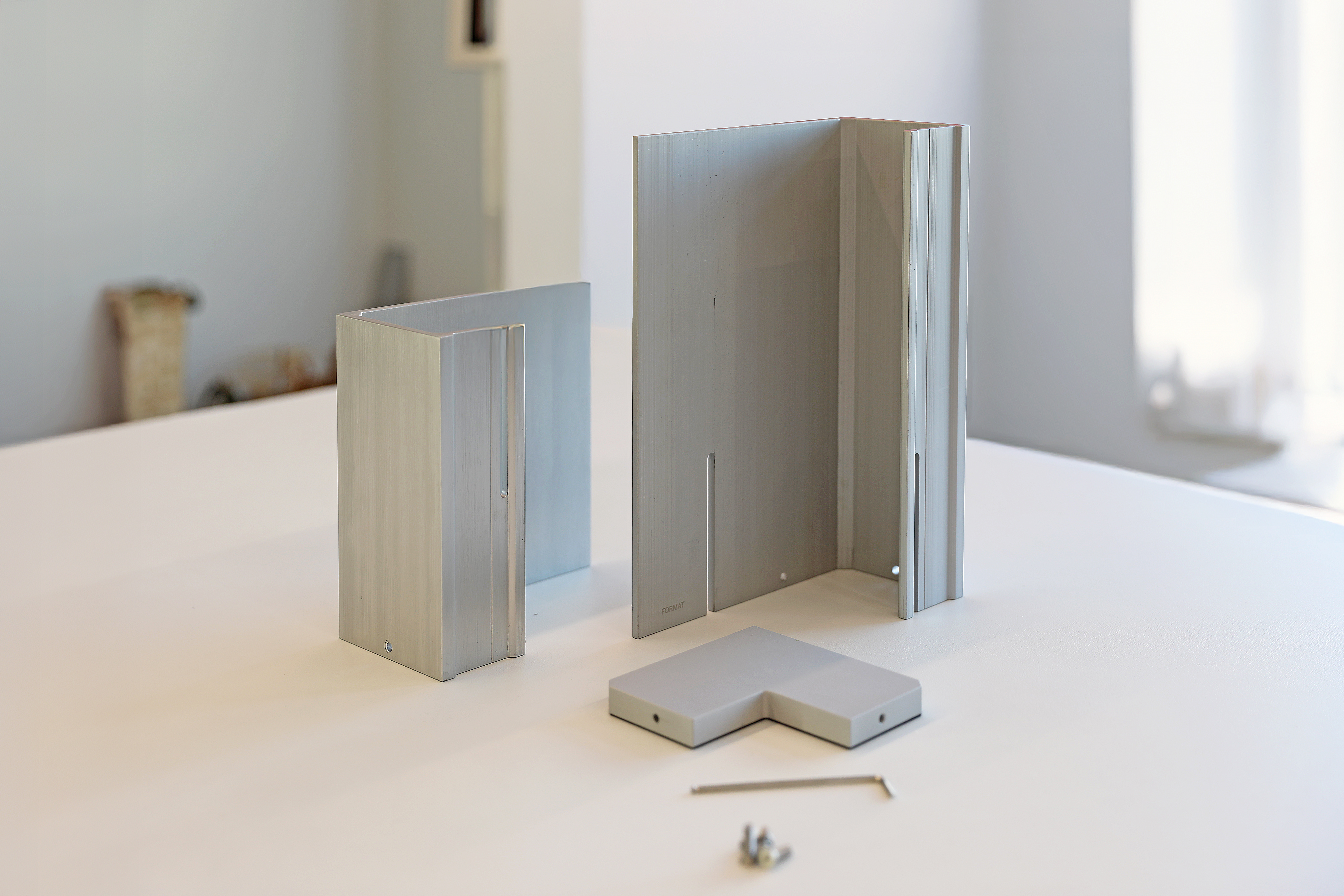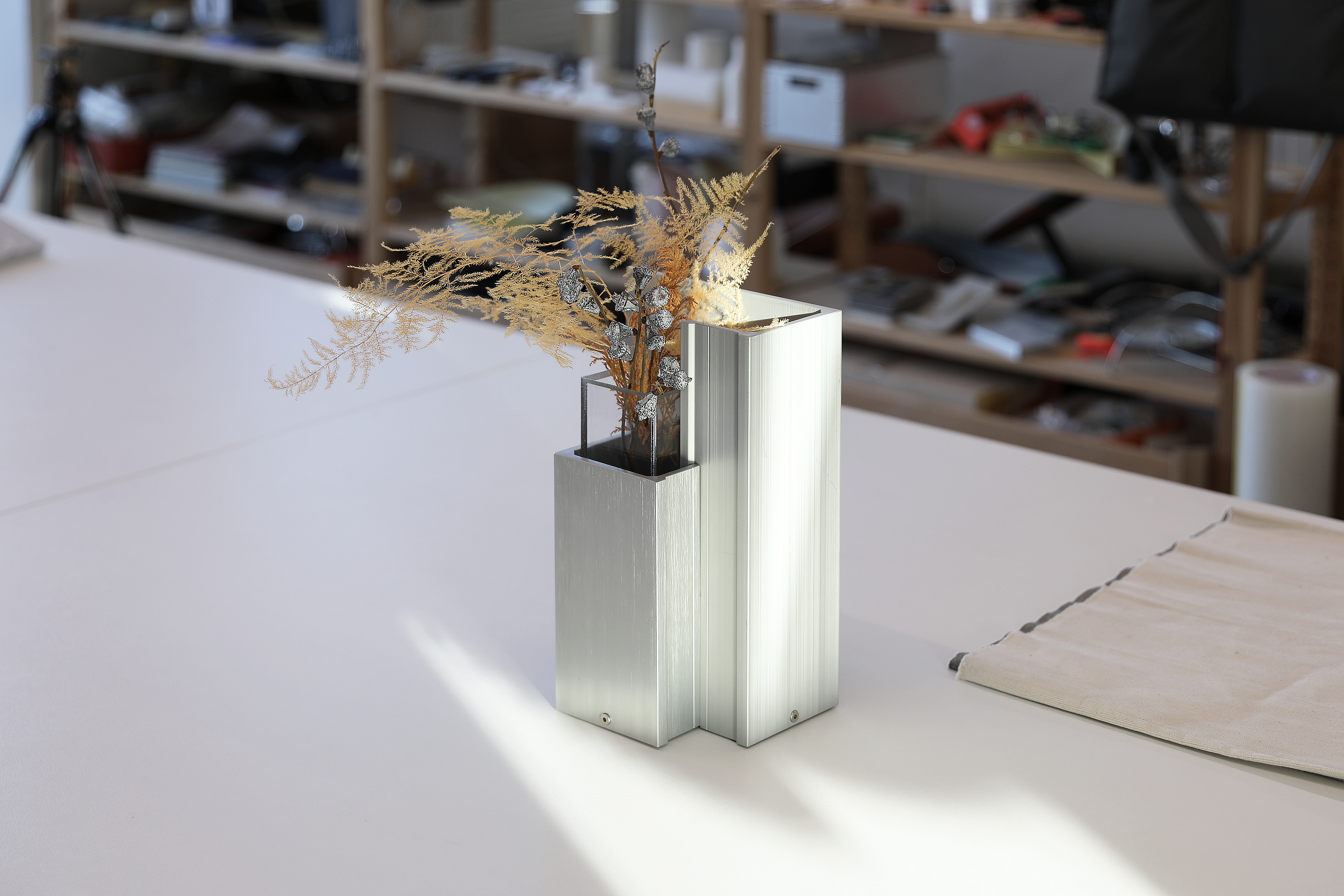 The second product in the collection is a vase. Standardized formwork components are disassembled into smaller units, cut, and reassembled into a new structure to create a single vase object. Through this process, heavy construction hardware is transformed into an interior object suited to everyday living. Traces of industrial use are not concealed but carefully refined within a restrained form, allowing the material’s previous context to remain visible.