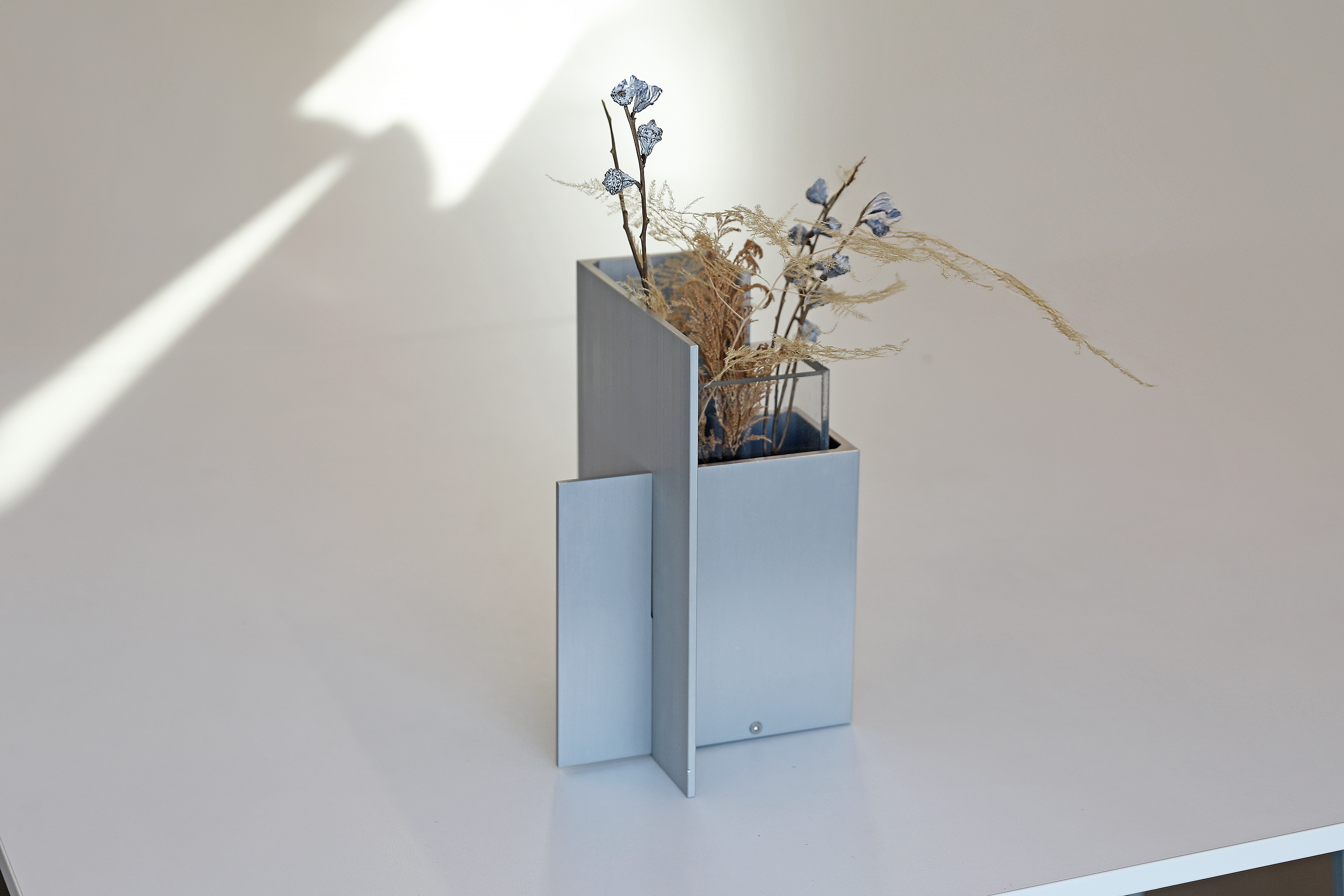 The vase features a grid-like assembly structure derived from the repetitive and modular nature of formwork hardware. This structure recalls an urban skyline, while the contrast between the rigid metal framework and organic plant forms creates a subtle tension and balance. Functionally, the vase is designed to hold water with structural stability, resulting in an object that integrates both sculptural presence and practical use.